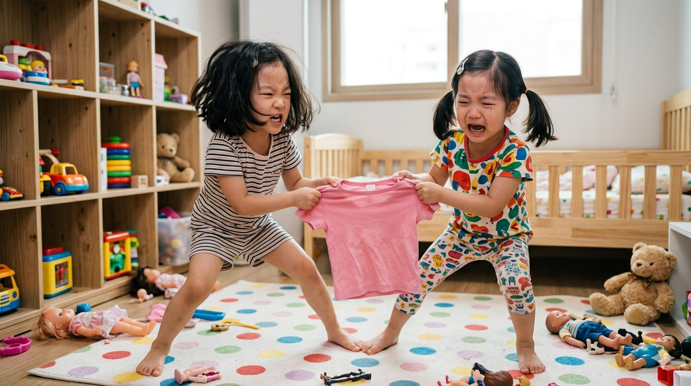 두 아이 모두 핑크색 옷을 입겠다고 울고불고 난리가 났다. 서로 자기가 입겠다고 소리 지르고 울고, 결국 둘 다 기분이 상해서 하루 종일 분위기가 좋지 않았다.