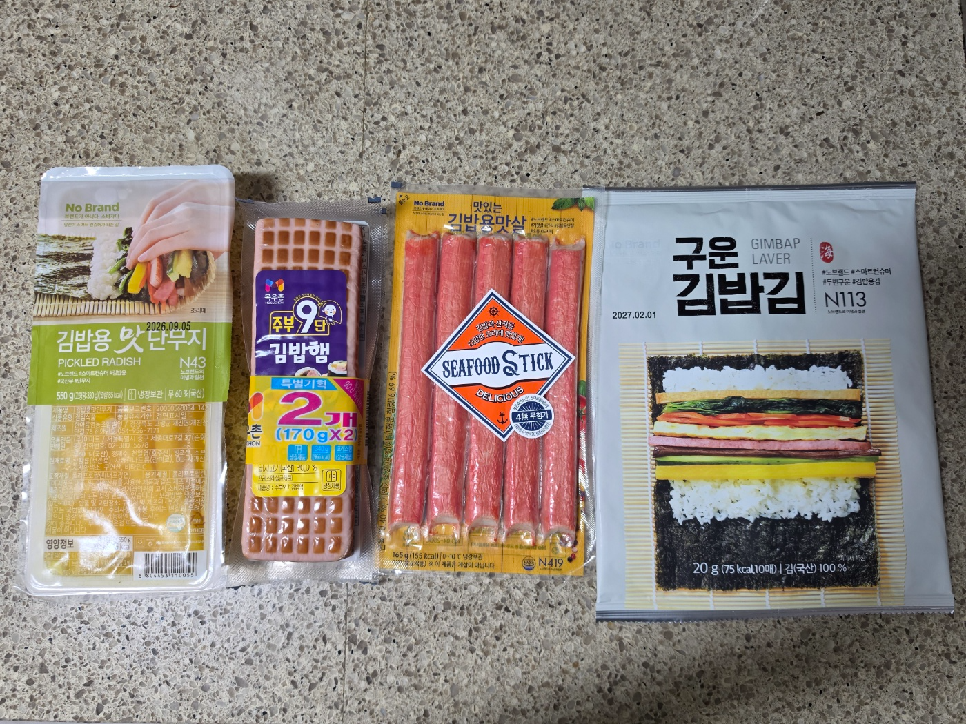나는 아이들이 쉽게 만들 수 있도록 재료를 간단하게 준비했다. 집 근처 노브랜드 매장에서 김, 단무지, 맛살을 구매했고, 주부구단 김밥김도 함께 준비했다. 집에 있던 당근과 계란을 활용해서 기본적인 김밥 재료를 완성했다.