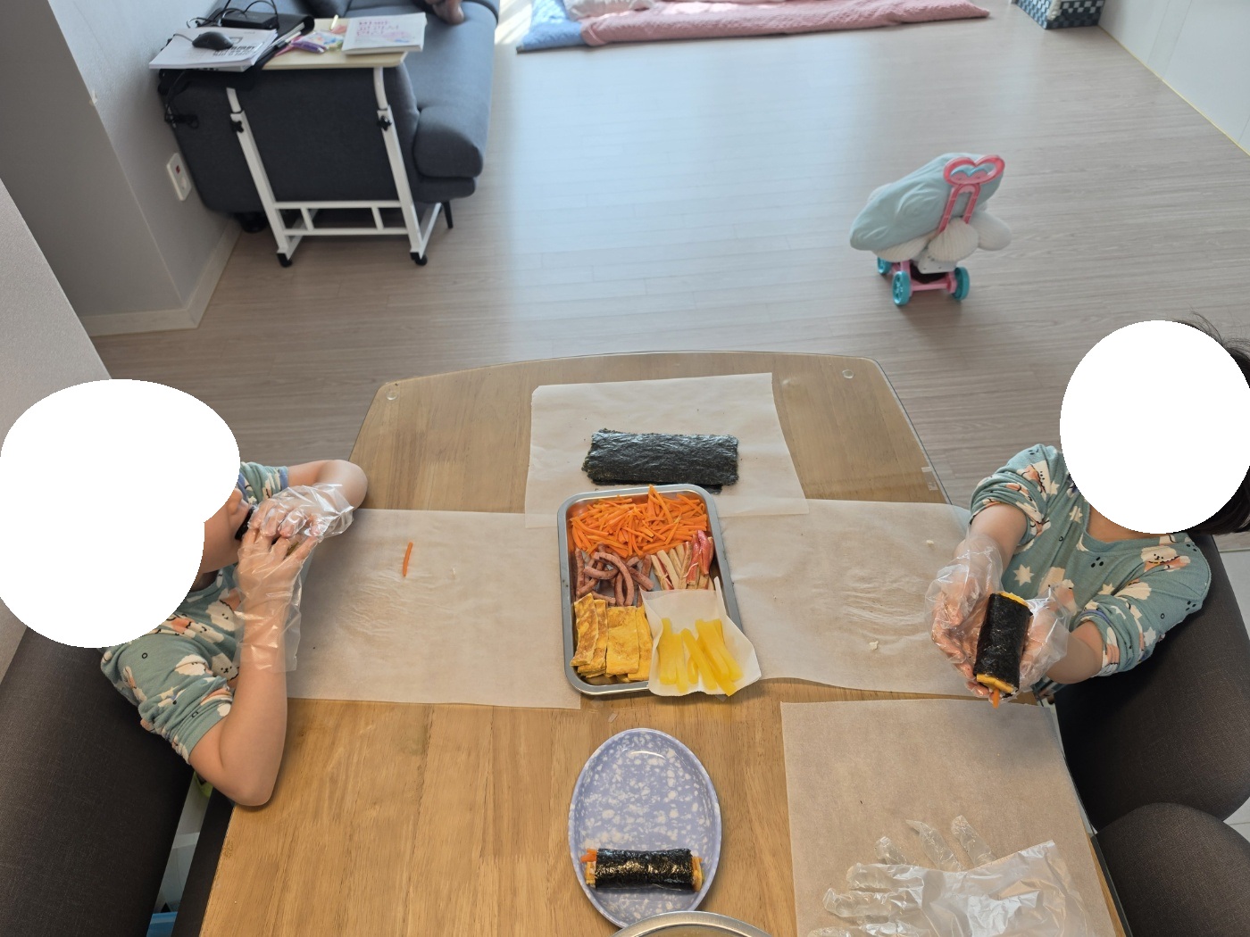 아이들은 내가 김밥을 만드는 모습을 유심히 보면서 그대로 따라 하기 시작했다. 작은 손으로 김 위에 밥을 올리고 재료를 하나씩 올리는 모습이 정말 인상적이었다.